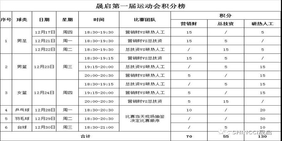 以上是晟启第一届运动会所有项目,团队总积分排名情况如下